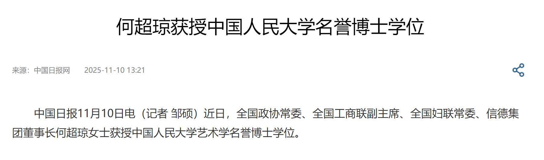 2025年11月7日,何超琼获授中国人民大学艺术学名誉博士学位。